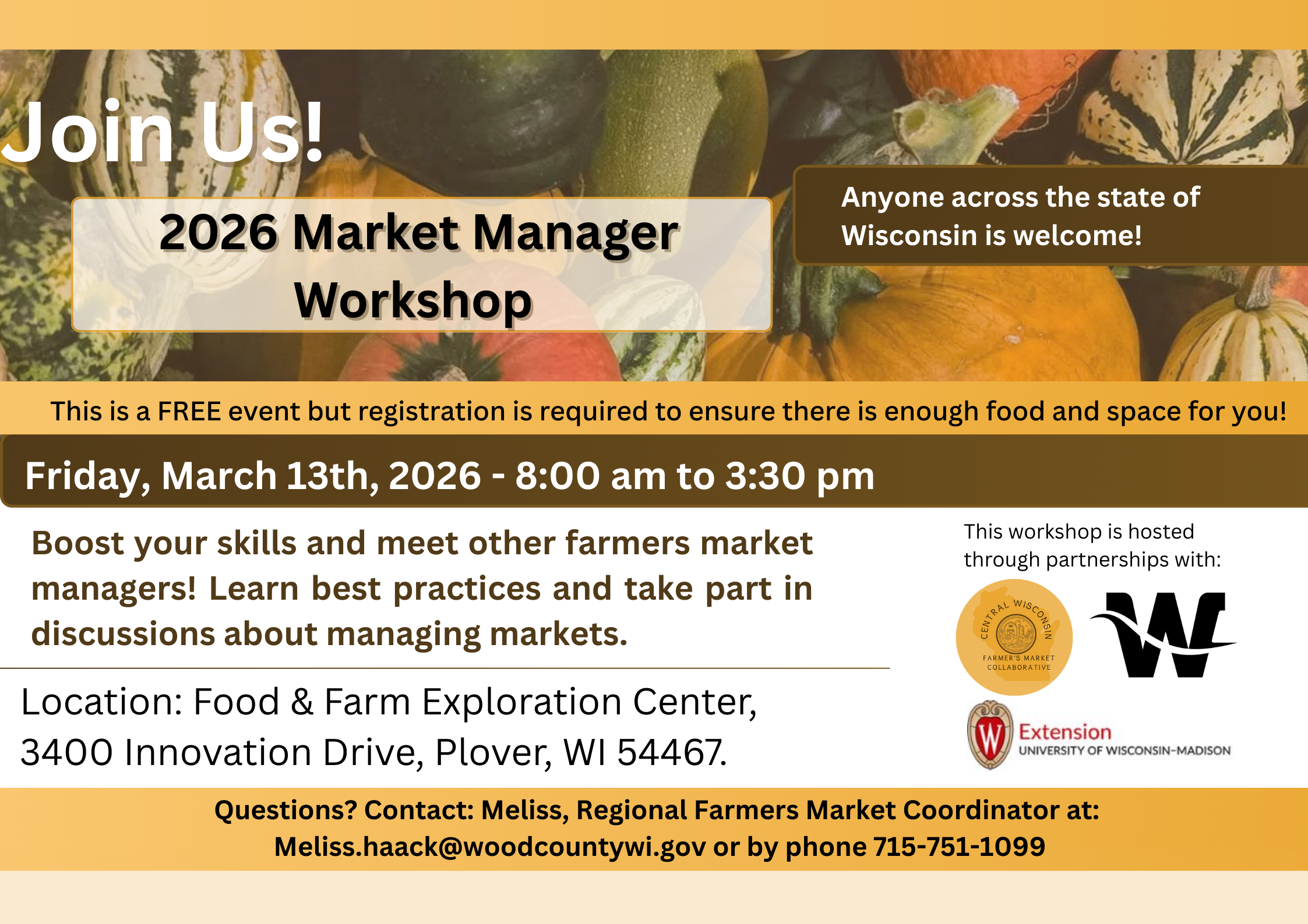 This is a great chance to connect with others in the Central Wisconsin Farmers Market Collaborative at Wisconsin's only Market Manager Workshop this year.